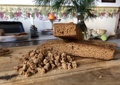 Am Heiligen Abend gegen Nachmittag den Soßenlebkuchen klein würfeln und zunächst ca. 2-3 Hände voll in die kochende Brühe geben und unter Rühren auflösen.